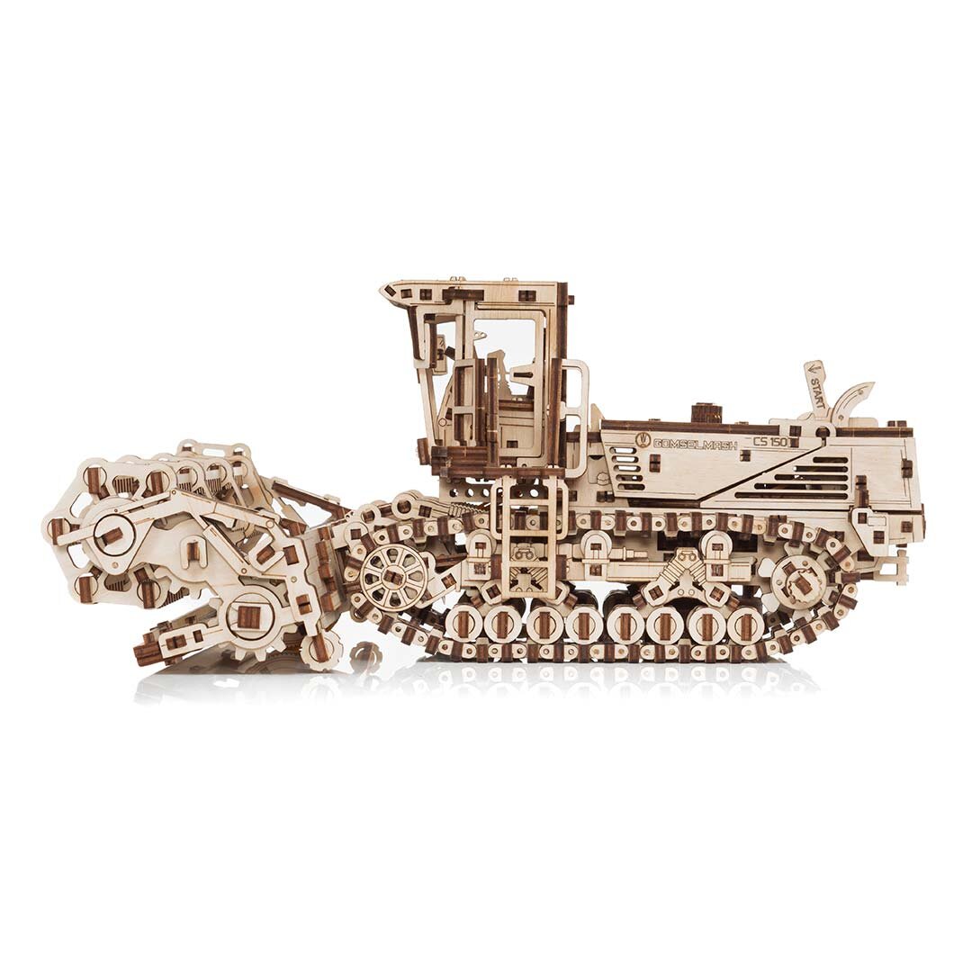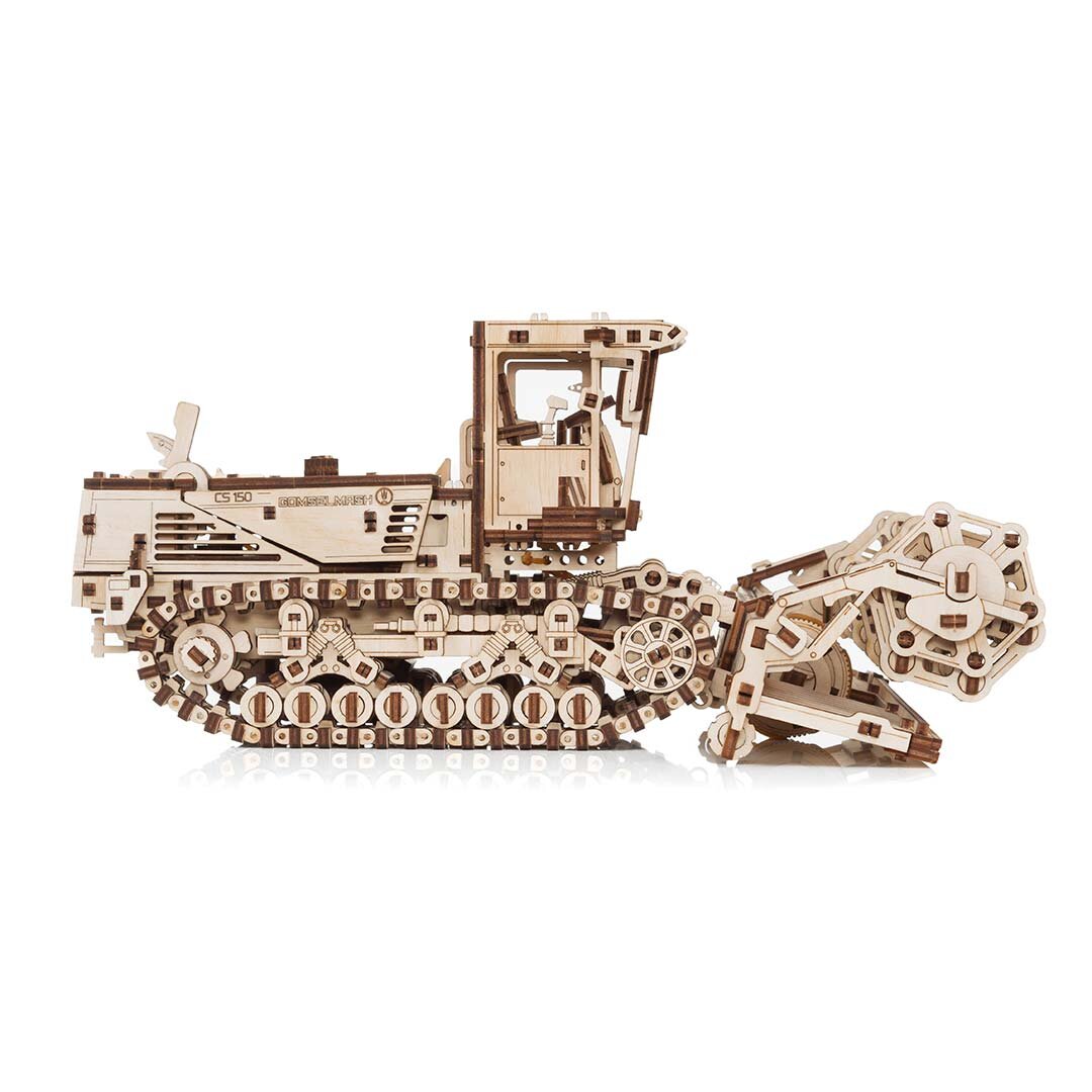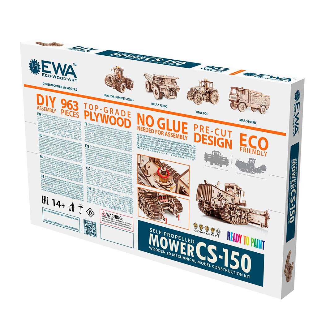 Descoperă lumea fascinantă a modelelor realiste din lemn cu puzzle-ul mecanic 3D 🌾 Mașină de tuns iarba autopropulsată CS-150C de la Eco Wood Art. Acest model detaliat a fost creat în cooperare cu companiile de inginerie din Belarus Gomselmash și ZLiN și oferă o experiență autentică de construire a unei mașini agricole.